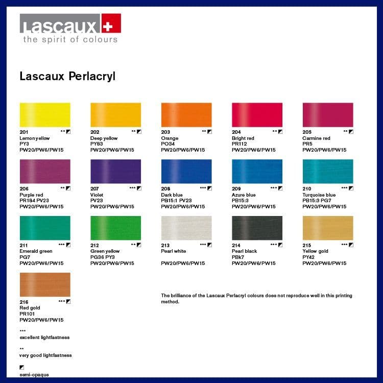 Characterised by its intensive iridescent lustre Lascaux Perlacryl is a highly pigmented, pearlescence acrylic colour that dries scratch, water- resistant and non-ageing. This exceptional colour range consist of 12 pure strong tones complimented by Yellow Gold, Red Gold, Pearl White and Pearl Black and is favoured by artists, architects, illustrators, decorators and designers. Lascaux Perlacryl has a very good coating flexibility and a high gloss level. It is suitable for use with virtually all painting techniques including airbrush and Screenprinting.